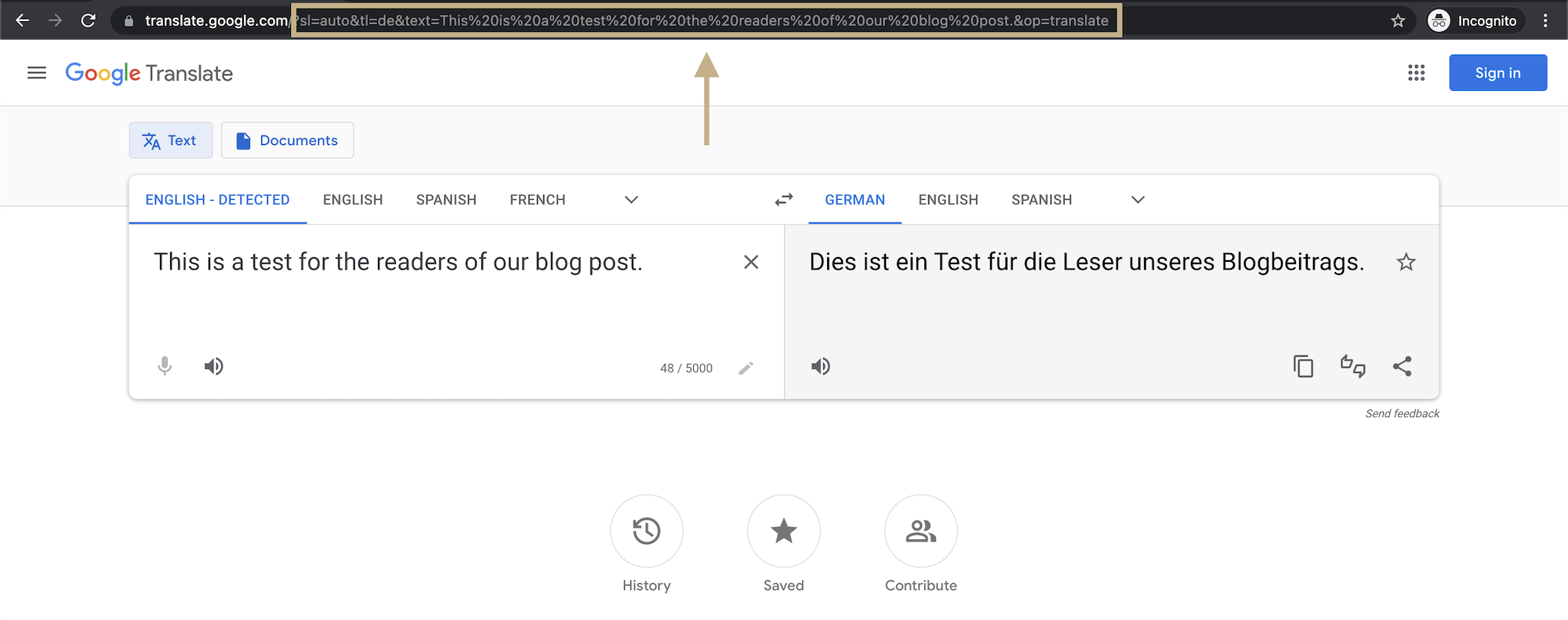 When you enter text in Google Translate, DeepL or similar freely accessible MT tools, the text is shown in the URL together with the selected language pair. The URLs you visit can then be seen in your browser history.