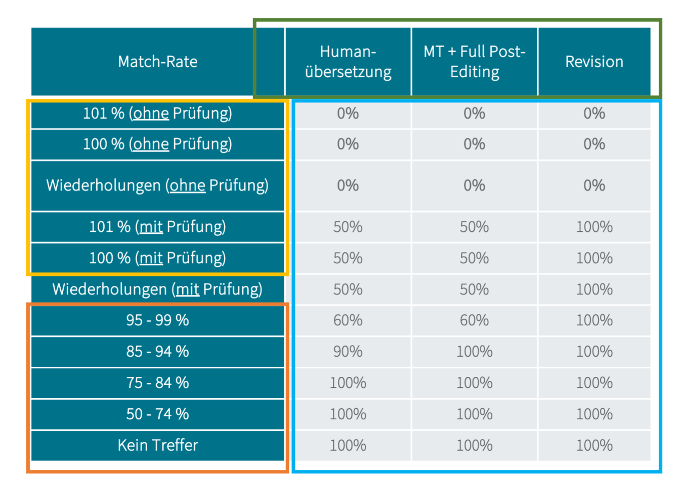 - The orange box shows the percentage figures from the CAT tool analysis. The CAT tool analysis compares the new documents to be translated with previously translated texts and the translation memory. The more similar individual text segments are, the higher the match rate (in the orange box) and the less you’ll pay.
